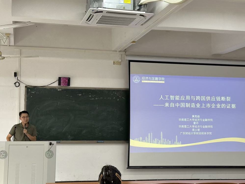 2025年10月23日下午,由科研处和教师发展中心联合主办,国际经贸规则研究中心、经济学院和广东服务业数字化发展与管理创新研究基地承办的南国“争鸣”系列学术沙龙之第13期在F402顺利举行。本期沙龙聚焦“人工智能应用与跨国供应链断裂”这一前沿议题,特邀华南理工大学经济与金融学院博士生导师黄亮雄教授担任主讲嘉宾。