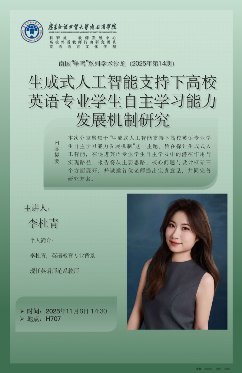 本校定于11月6日14:30在教学楼H栋707举办南国“争鸣”学术沙龙(2025年第14期)生成式人工智能支持下高校英语专业学生自主学习能力发展机制研究。