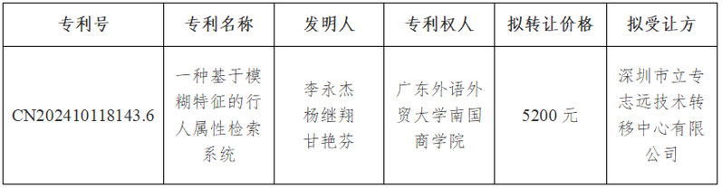 “一种基于模糊特征的行人属性检索系统”发明专利权为广东外语外贸大学南国商学院拥有。经研究,我校拟进行成果转让,经使用天眼查软件系统查询,发明人与拟受让方深圳市立专志远技术转移中心有限公司不存在关联关系。按照教育部科技部等《关于加强高等学校科技成果转移转化工作的若干意见》教技〔2016〕3号及学校相关管理办法的规定,现将我校拟转让发明专利权事宜予以公示,公示期15日,自2025年11月21日至2025年12月5日止。任何单位和个人如对转让有异议,可于2025年12月5日下午5:00前以书面形式送交知识产权管理与成果转移转化办公室(地址:行政楼206室)。异议应当签署真实姓名或加盖单位公章,并注明联系方式,逾期不予受理。