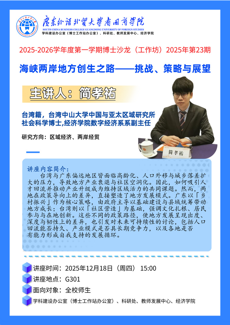 主讲人简介:简孝祐,台湾籍,台湾中山大学中国与亚太区域研究所社会科学博士,经济学院数字经济系系副主任,研究方向:区域经济、两岸经贸。