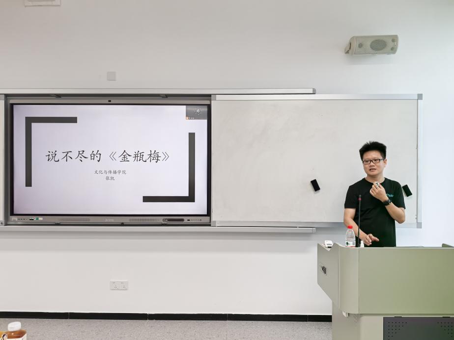 9月18日下午,由图书馆主办的“师生共读经典”系列活动第二期(总第42期)于教学楼H803顺利开展,现场座无虚席,气氛热烈。本次活动特邀文化与传播学院张凯老师担任领读人,以“说不尽的《金瓶梅》”为题,从学术、文本与社会三个维度,引领在场师生一同解读这部在中国文学史上极具文学与社会价值却又屡遭争议的经典作品。活动开始前,图书馆已收到来自同学们的40份读书心得与思维导图,充分展现大家对《金瓶梅》一书的预先研读和积极参与的热情。