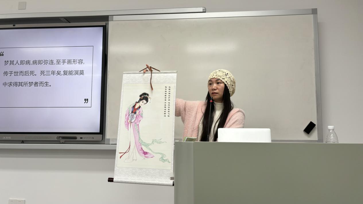 10月30日,图书馆第七期(总第47期)“师生共读经典”活动于教学楼H803顺利举行,现场座无虚席。文化与传播学院教师郑如文担任领读人,结合《牡丹亭》文本、梅兰芳等艺术家的演出影像及相关研究成果,带领同学从戏曲美学维度理解“情”的审美内涵,深入探讨女性成长与自由人格等主题。
