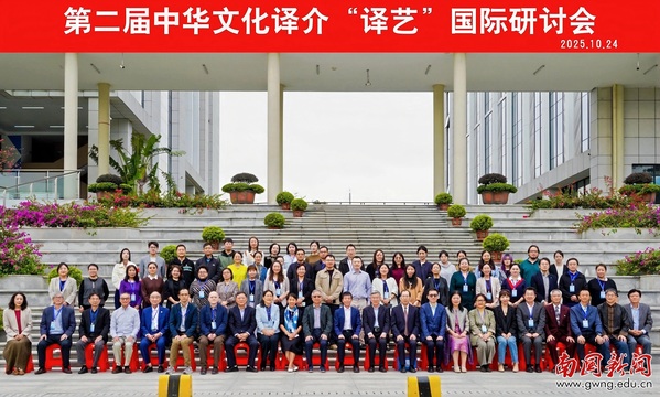 本网讯10月24日下午,由我校主办的第二届中华文化译介“译艺”国际研讨会在国际学术报告厅开幕。在为期一天半的会期内,来自国内高校、科研机构及出版单位的众多专家学者通过主旨演讲、圆桌论坛等密集议程,围绕核心议题进行深度交流,搭建起高水平的学术对话平台。我校副校长曾用强主持开幕式。王华校长在开幕式致欢迎词时指出,翻译是文化互鉴与民族进步的重要动力。面对AI技术冲击,他提出“拥抱技术、坚守人文”的理念,强调新时代翻译人才需兼具技术协同、专业素养、跨文化传播与战略创新能力,呼吁高校革新教育,以技术为工具、文化为内核,推动中华文化“走出去”。中国翻译协会常务副会长黄友义在致辞中充分肯定了我校在中华文化译介与传播方面的成果。他强调,译介是连接中华文化与世界文明的重要桥梁,也是讲好中国故事的关键载体。面对当前国际传播新形势,他鼓励更多青年学子投身文化译介事业,提升跨文化传播能力,为推动中华文化走向世界、促进文明交流互鉴贡献力量。合影留念研讨会设置了多场主旨演讲,10位国内外知名学者围绕中华文化译介的关键议题分享了前沿成果。复旦大学二级教授陶友兰以《国际传播视域下翻译教育创新路径与人才培养实践探索》为