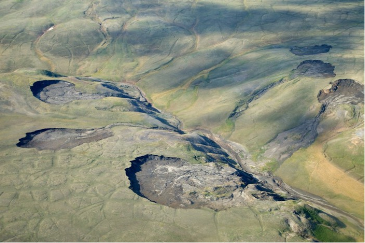在北极地区,地表活动异常频繁,面积达数平方英里的大型湖泊在短短几天内消失得无影无踪。山坡发生滑坡,富含冰层的土地塌陷,使得原本平坦的地表变得起伏不平,在某些地区形成了大面积的凹陷多边形地貌。这些现象表明,地表下长期冻结的多年冻土层正在发生融化。