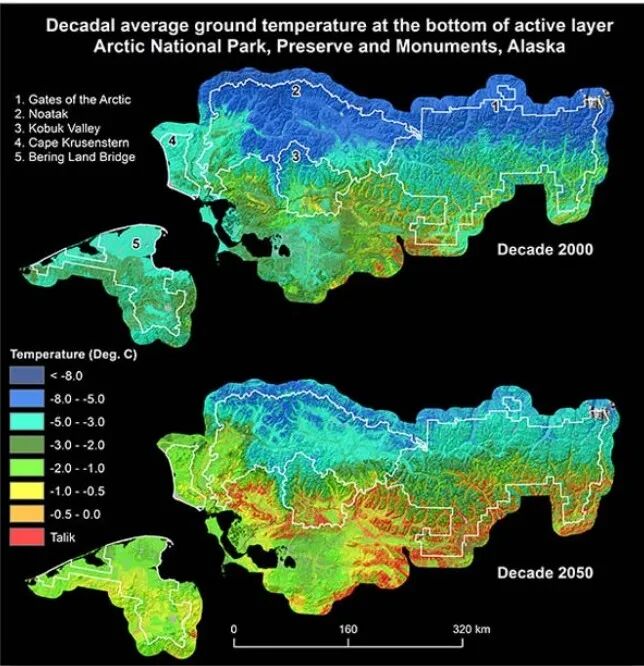 这一现象尤其令人担忧,《IPCC 第六次评估报告》指出当前永久冻土中储存的碳含量约为大气中碳含量的两倍。永久冻土的深度在不同地区差异显著。在西伯利亚的部分地区,其深度可超过3000英尺(900米),而在阿拉斯加北部则可达2000英尺(600米),向南则迅速降低。以阿拉斯加费尔班克斯为例,其永久冻土的平均深度约为300英尺(90米)。研究表明,如果全球变暖的现状持续,深度在10英尺(3米)或更浅的浅层永久冻土可能会大规模融化。