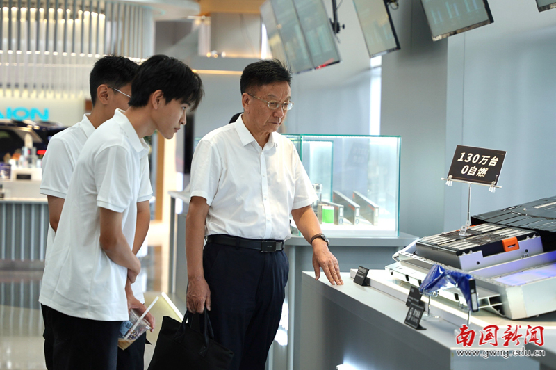 党委书记“思政第一课”结束后,在企业专业讲解员的引导下,师生团队沿着习近平总书记的考察足迹,开启了沉浸式研学之旅。在科技体验馆,大家通过智能驾驶模拟、多媒体交互等前沿科技,亲身体验未来出行场景,全方位感受广汽埃安在电池技术、智能网联等领域取得的突破性创新成果。在高度自动化的生产车间,学员们近距离观摩了新能源汽车从零部件到整车的全流程智能制造过程,对“新质生产力”有了具象化的认知。一件件实物、一项项技术、一道道工序,让抽象的理论变成了可知可感的现实,极大地激发了学员们的求知欲和民族自豪感。
