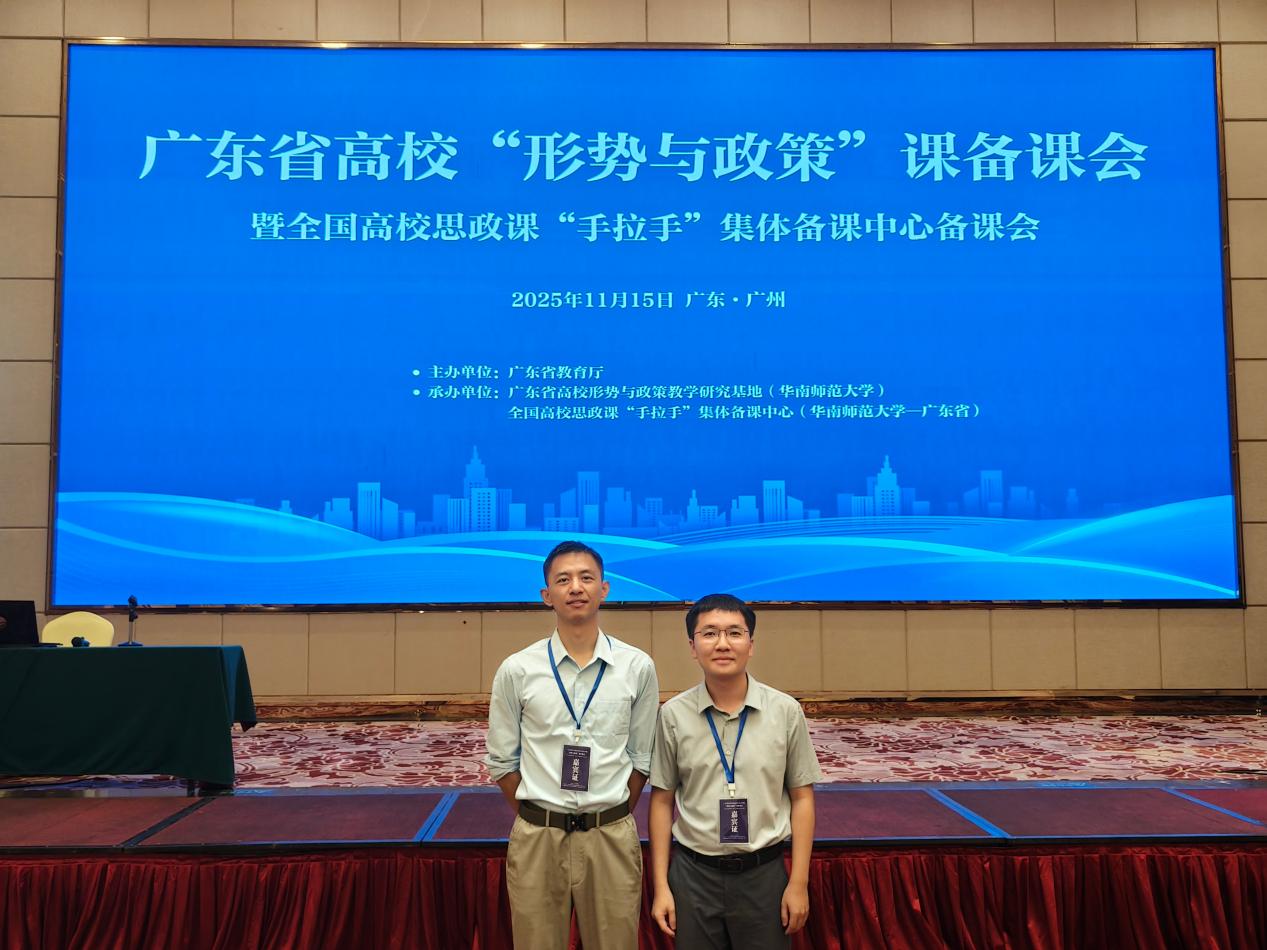 日前,由广东省教育厅主办、华南师范大学承办的2025年秋季学期广东省高校“形势与政策”课备课会暨全国高校思政课“手拉手”集体备课中心备课会在广州举行。我院选派青年教师熊诗遥、郑林彬参加会议。