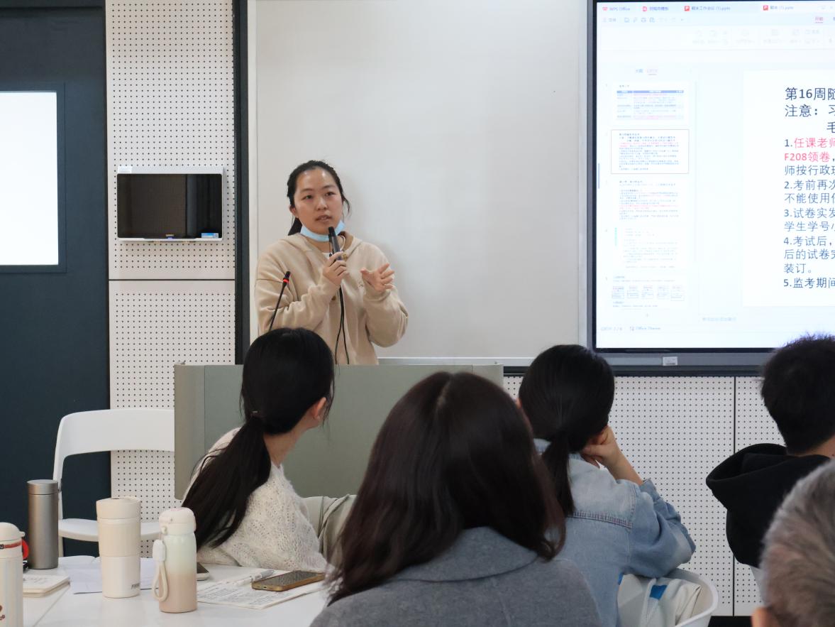 随后,教务秘书陈韵茵老师就本学期期末考试工作的具体安排与要求进行了详细说明。她围绕考试监考规范、试卷评阅细则、成绩录入流程、教学材料归档标准等各个环节进行了逐一解读,明确了时间节点与责任要求,确保期末各项考务与教学工作严谨、规范、有序开展。