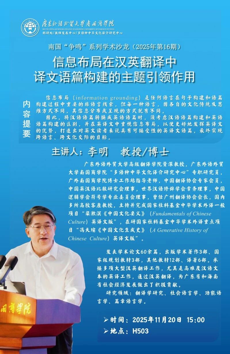 【活动预告】“信息布局在汉英翻译中译文语篇构建的主题引领作用”学术沙龙