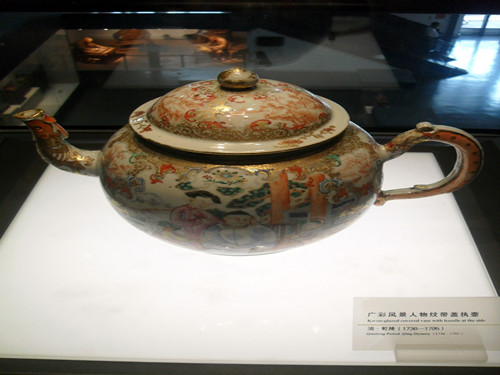 清乾隆时期广彩风景人物纹带盖执壶(郑玉莹 摄)