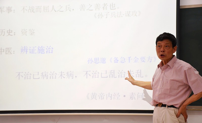 伍巍教授引用大量的古文,生动地阐释中国传统文化对现代人的启迪,语气激昂,彰显其个人深厚的文化底蕴。例如,他认为“明道”引导人们要顺应自然规律,不应过度开发自然,否则将为此付出代价,随后他提出“平衡”“得失之辩”“世间万物,相生相剋”等观点。在“崇智”方面,伍巍教授提出“人要有知识,要有独立的判断”,他通过借用古人的观点来阐述“崇智”对当代哲学、军事、历史、中医和政治方面的启迪。关于“崇智”对当代哲学的启迪,伍巍教授借用了道家的“返璞归真,天人合一”;关于“崇智”对军事的启迪,他借用了《孙子兵法•谋政》中的“不战而屈人之兵,善之善者也”;在历史方面,他则借用了《资治通鉴》;而在中医方面,他认为孙思邈的《备急千金要方》中的“辨证施治”启发中医医师应有这样一种职业道德——在替患者医治时把患者当作独一无二的个体,而这恰恰也具有哲学思辨性。此外,他还通过《黄帝内经•素问》中的“不治已病治未病,不治已乱治未乱”阐述养生之道;至于政治方面,他引用大量丰富的史书记载进行相关的佐证与解说,譬如有《后汉书•崔骃列传》的“刑罚者,治乱之药石也,德教者,兴平之梁肉也”,《论语•为政》的“道之以政,齐之以刑,民免而无耻;道之以德,齐之以礼,有耻且格”,顾炎武的《日知录》的“善为国者,藏之于民”以及黄宗羲的“天下之治乱,不在一姓之兴亡,而在万民之忧乐”。