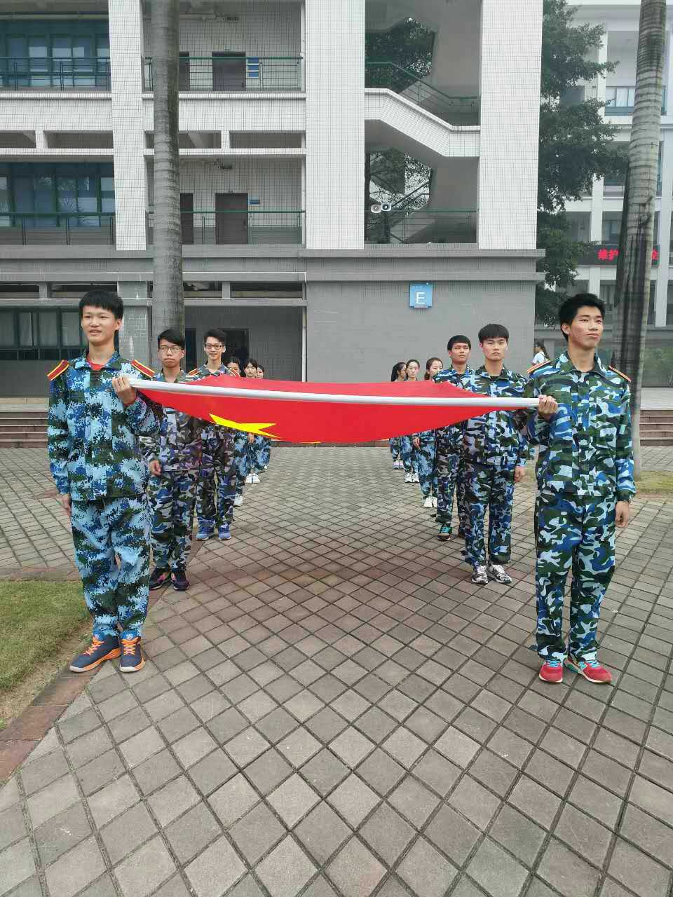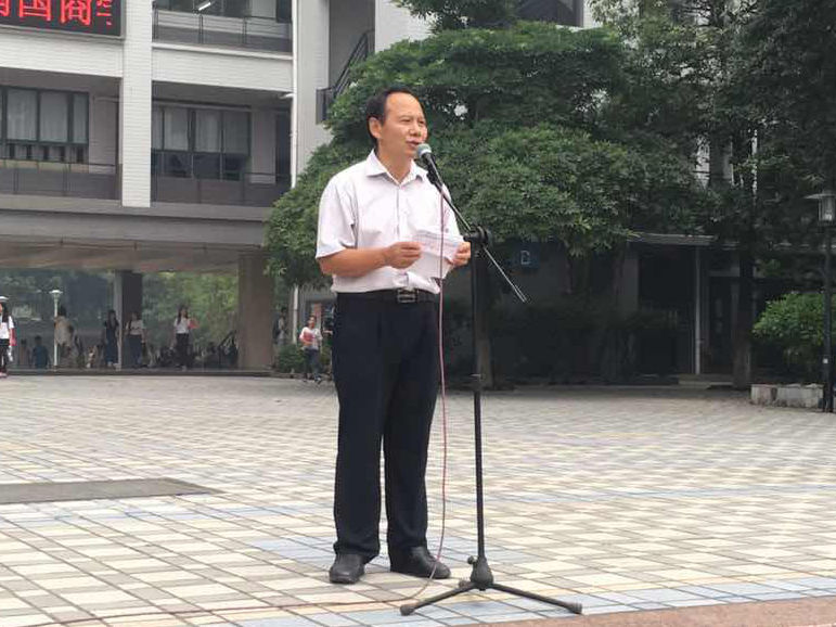 在主持人的宣布下,升旗仪式正式开始,升旗结束后由党总支书记吴锦德做国旗下的讲话。吴锦德书记首先表示对2016级新生的欢迎,并向新生们介绍中文学院的师资力量。接着介绍了我校在各个领域取得优异成绩的荣誉校友,并希望同学们能以南国为荣。