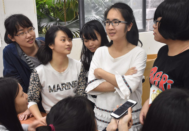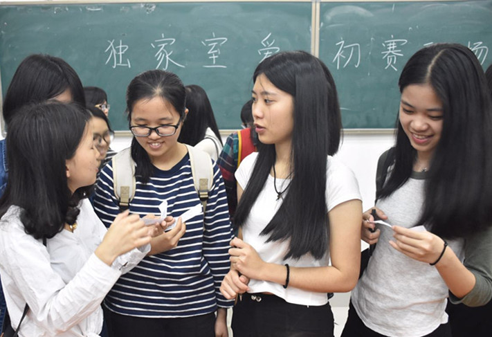 跟往年一样,选手们绞尽脑汁完成各环节的题目,比赛现场的气氛异常热烈。在排队等候期间,靠后的选手还不忘伸长脖子,偷看前面选手的题目,然后转身与自己的舍友紧张讨论。