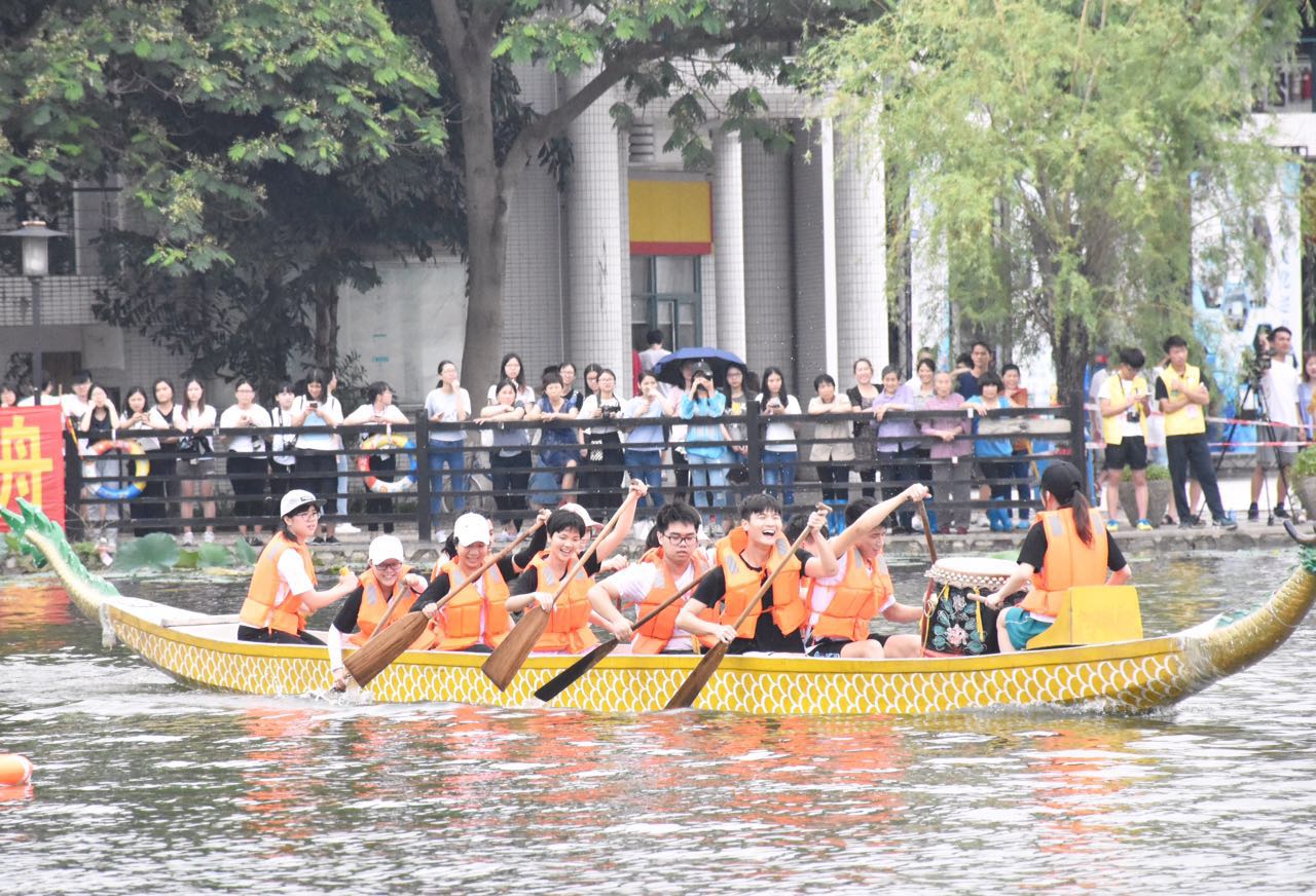 教工组与保卫处合作参赛。队员们跟着鼓手的节奏,齐心协力地用力挥桨,在桨一上一下地击水前进的过程中,保卫中文教工组龙船奋力向终点冲刺。他们的默契配合赢得岸上中文学子的阵阵喝彩。