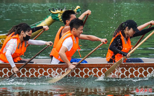 “妹妹你坐船头,哥哥在岸上走……”除了划水声、鼓声、欢呼声,湖面还传来了一阵响亮的歌声,原来是信息科学技术学院龙舟队在回程的时候唱起了经典老歌《纤夫的爱》。2018级计算机科学与技术专业的温森荣表示,唱这首歌的原因是因为它不仅经典,还能鼓舞士气。在比赛中,他们也获得了亚军的好成绩,温荣森认为能够取得这样的成绩和平时的辛苦训练是分不开的。“我们每周会训练两天,即使天公不作美,下雨也没有延迟训练计划。训练的时候经常下雨,但大家一起低着头听着鼓声,按节奏拼命地划,一心朝同一个方向前进,就有一种振奋人心的力量。”