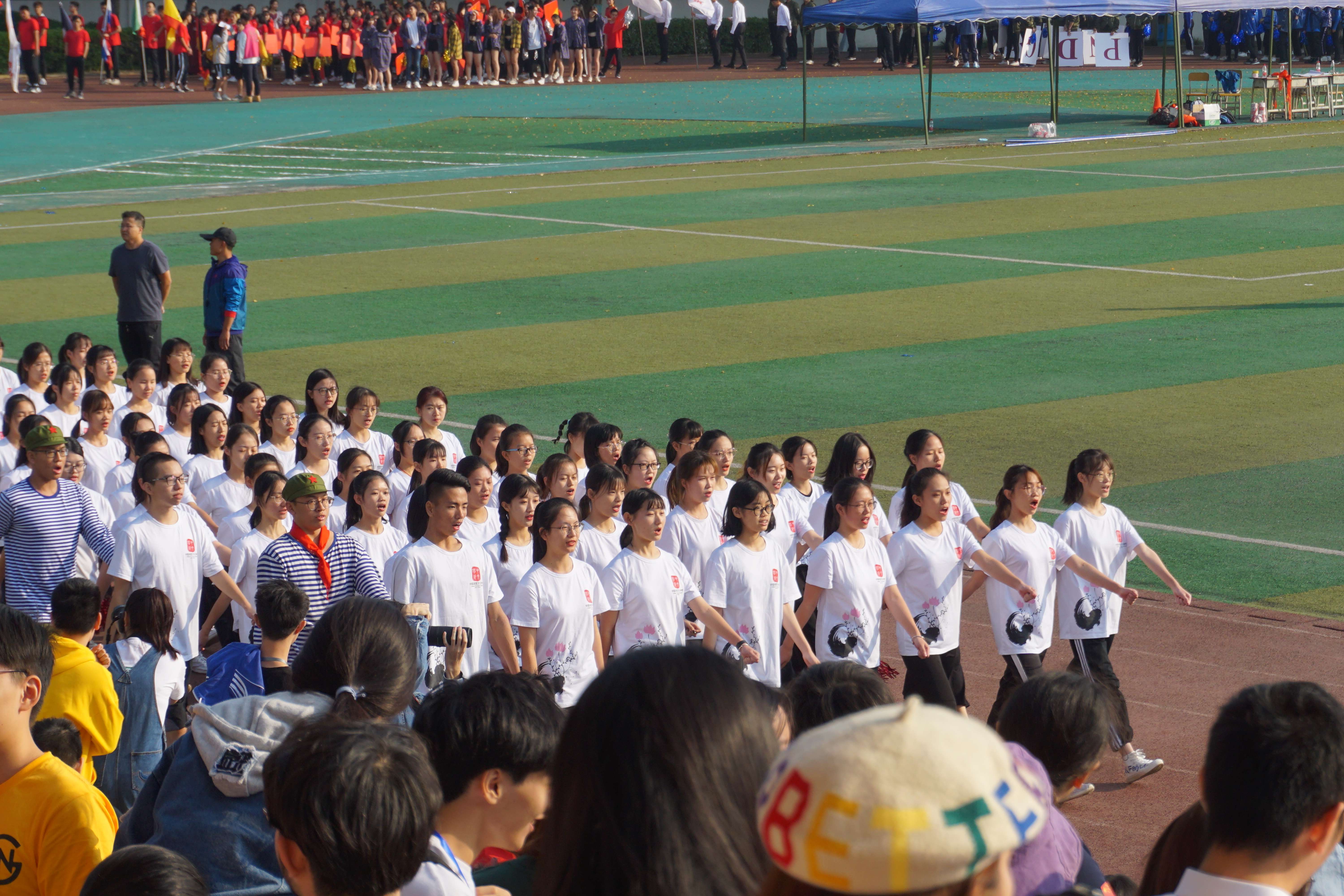 校运会开幕式伊始,在观众的倾情呐喊中,国旗护卫队和校旗队声如洪钟地喊着令人振奋的口号,迈着整齐而坚实的步伐,昂首阔步地走在队伍的最前面,各方阵队喊着嘹亮的口号紧随其后。随后,跃入眼帘的便是中国语言文化学院的队伍,一首首具有年代感的歌曲把我们带回00年代,他们整齐划一地用手语演绎了小虎队的《爱》,展示着他们的认真与用心。好曲不停,接下来的金曲《北京欢迎你》将我们带回了2008年。当熟悉的旋律再次响起,中院学子挥舞着手中的红旗,向我们展示了他们的热情洋溢。