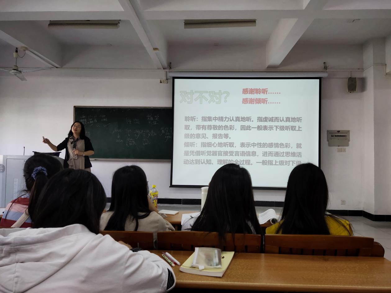 一是要准确贴切。中国汉字博大精深,很多汉字长得相似,实则有细微差别。通过讲述演讲中应注意的谦敬词、播放影视剧中雷人的台词、分析了同样是月亮而不同的描述却有不同的感情色彩等方面,同学们在愉快的课堂氛围中收获知识,收获快乐。老师循循善诱,同学认真聆听,课堂活力满满。
