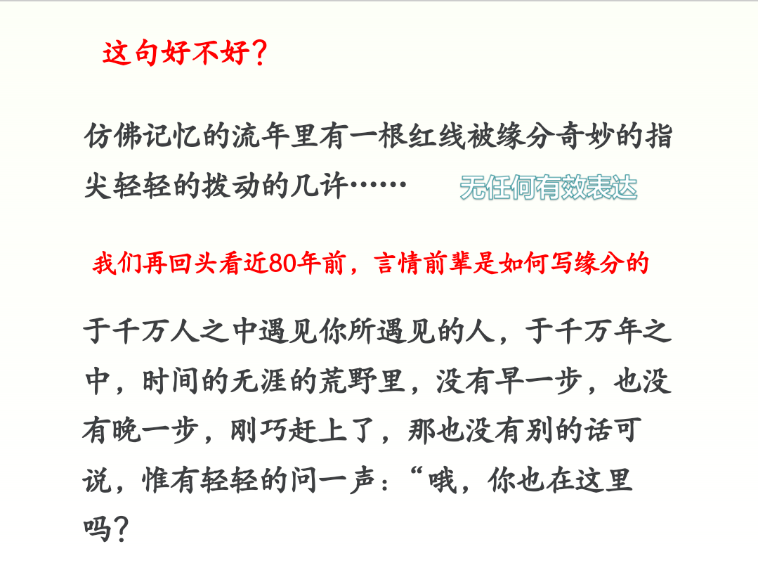 三是要生动形象,所用的语言要活泼新颖,使人映像深刻。徐琼一脸笑意地问大家:“你们知道I like you,but just like you是什么意思吗?”同学们纷纷积极地说出自己的答案,结果老师摇摇头说:“不,正确的翻译应该是这样的:纵然万劫不变,纵然相思入骨,我也待你眉眼如初,岁月如故。”课堂上突然哄堂大笑,同学们叹服于中华文化的博大精深。