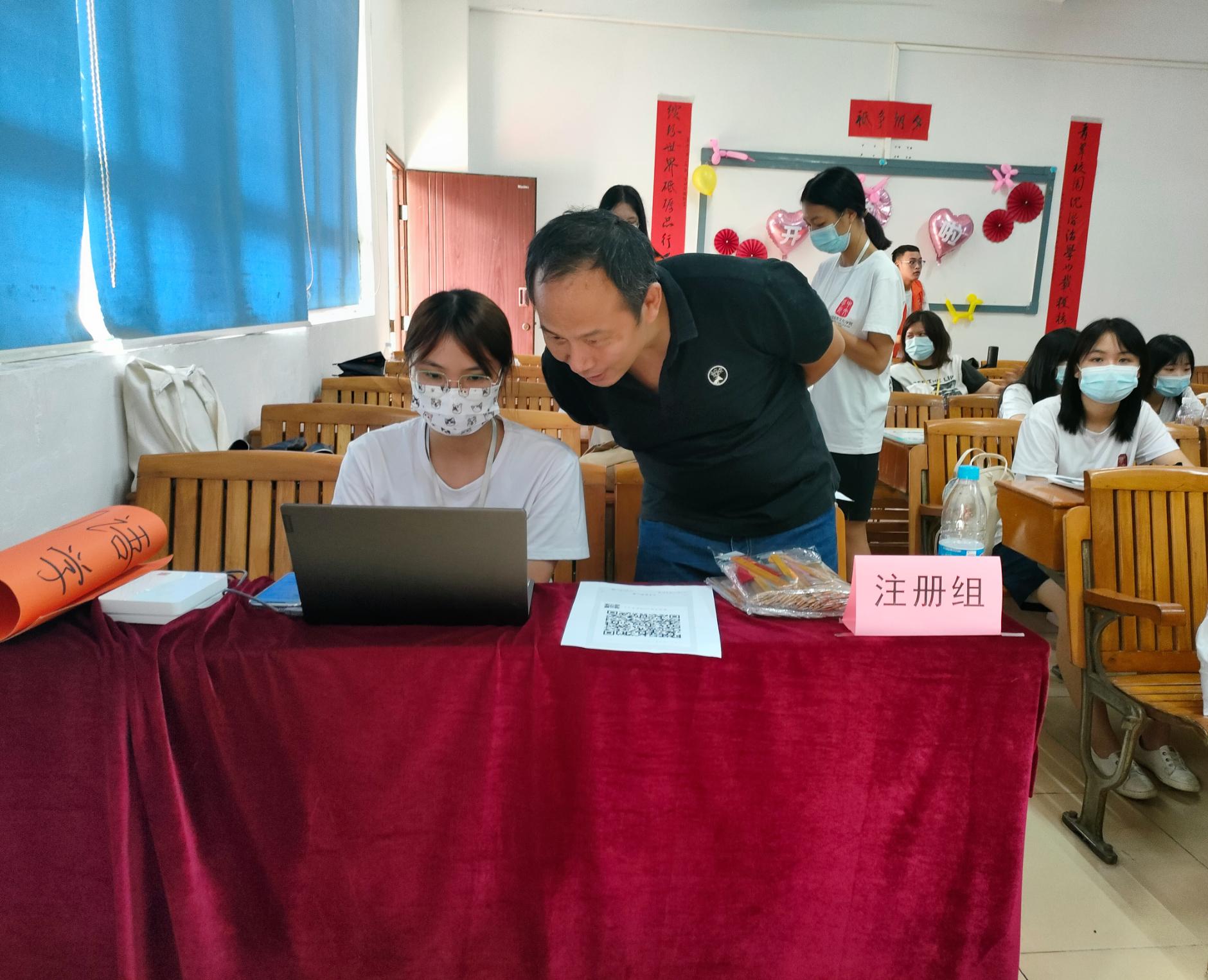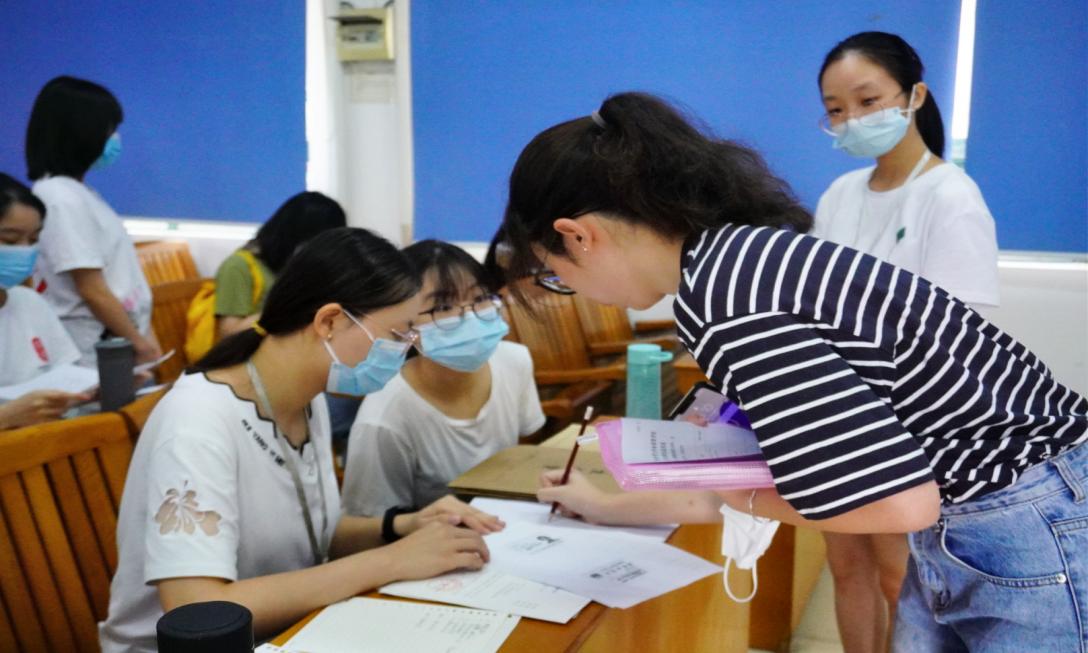 本网讯 9月11日,2021级新生陆续到校报到,中国语言文化学院院长王毅、党总支书记吴锦德、辅导员刘佳欣等在现场组织引导志愿者们进行新生报到工作。