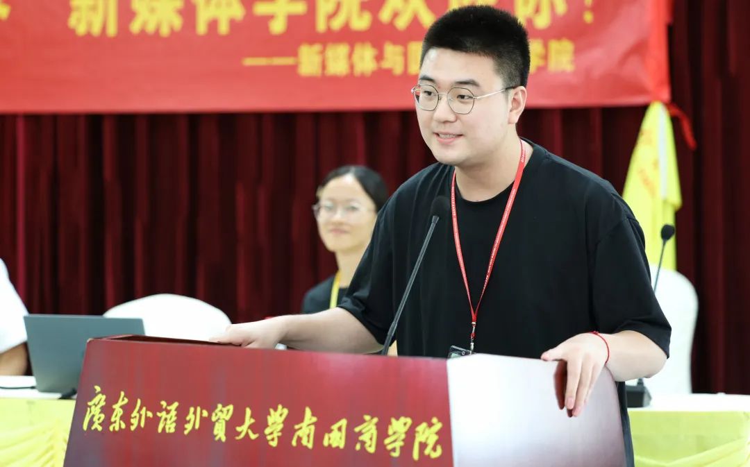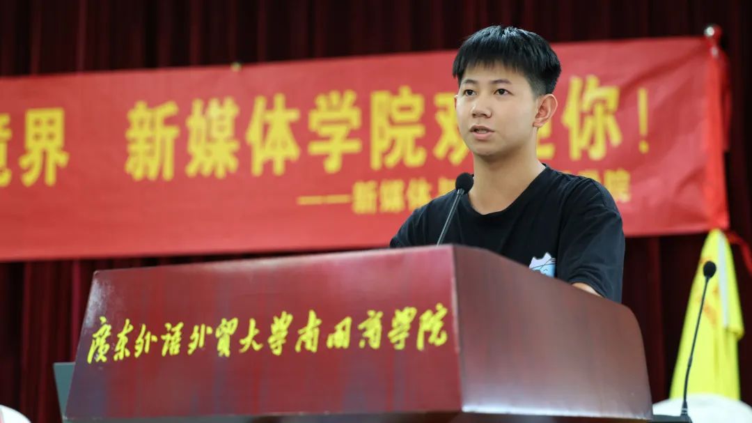 2020级网络与新媒体专业葛楷力作为学生代表发言,“新媒体学院现在作为广外南国最富有生机的学院之一,正在不断地努力完善。而我们就是实践的参与者和行动者,在大学四年中我们要学会如何做人,通过不断地实际操作,不断巩固,不断创作最终让自己成为一名优秀的新媒体人”。