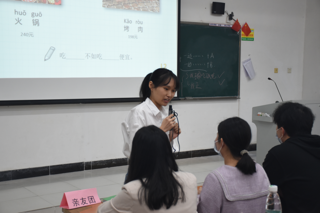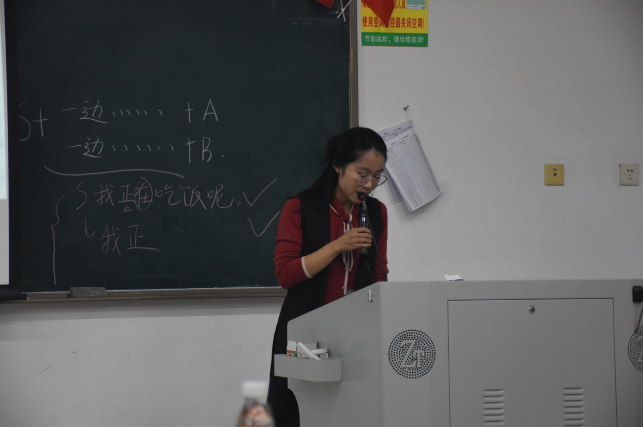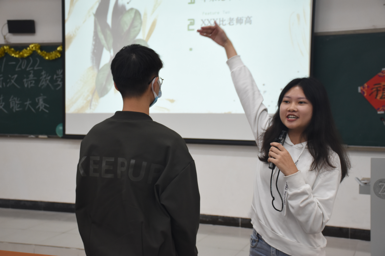 为了提高学生的教学技能,为他们在国际汉语教学教育领域的发展奠定基础,我院策划了本次比赛。比赛于15:20正式开始,共分为活动介绍、选手展示阶段、中场休息环节、选手展示阶段、评委嘉宾点评、颁奖环节、合影留念七个环节。选手展示流程为:选手依次进行“语法或语汇教学和教学问题处理现场问答”环节比赛,每位选手有十分钟左右的模拟教学时间,随后抽题开始教学问题处理现场问答。工作人员会在最后一分钟和三十秒时分别举牌提醒。总分共一百分,其中仪表仪态占十分,教学设计、言语表达、应变能力各占二十分,教学实施与课堂效果占三十分。