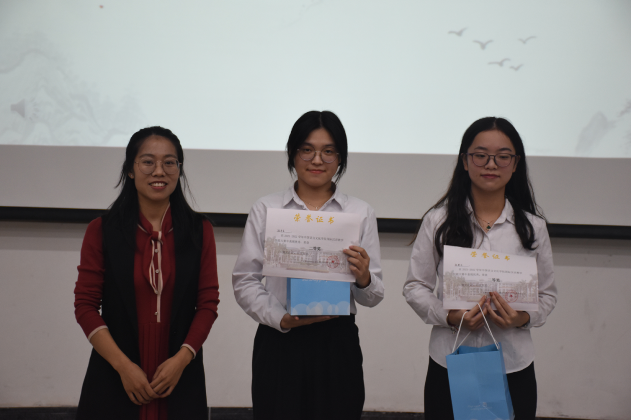 三等奖:谭锦连、郭炜铃、王慧瑜,由梁莉莉老师,刘佳欣老师为她们颁奖。