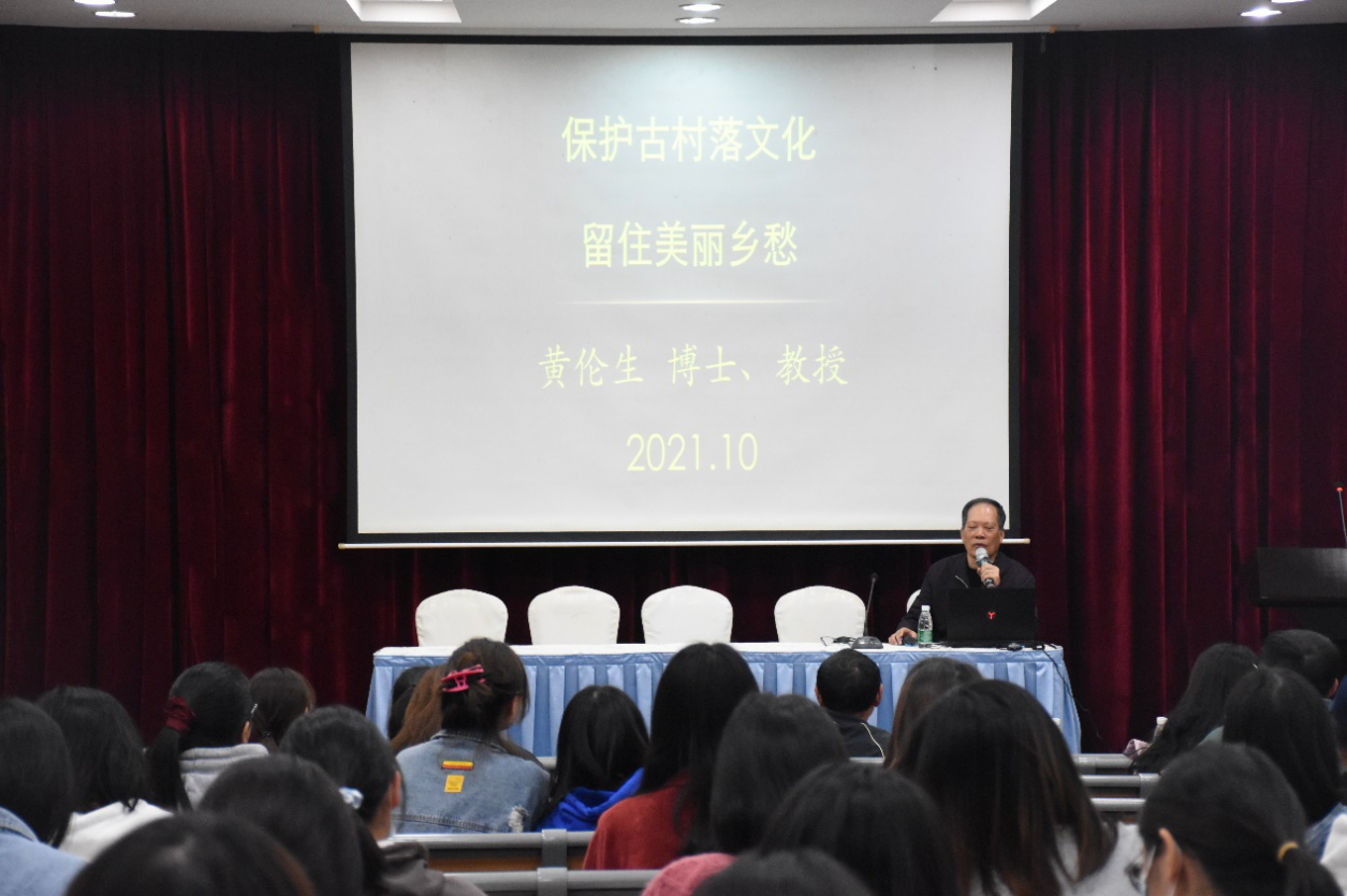 随后,黄教授提出古村落,即“半部国学”在民间的说法,并通过展示同学们一些精美的图片,让同学们了解古村落文化,他具体讲到古村落的构成要素与文化底蕴,如古村落的时间与空间的定义;古村落的环境与布局;一些装饰部件;古商铺、古巷道;古井、古树;非物质文化遗产等。其中他认为古树最能留住乡愁。