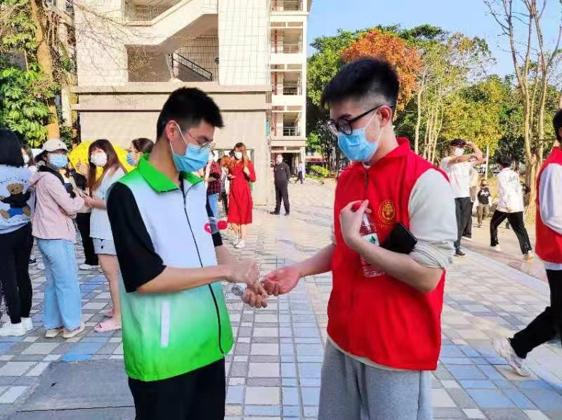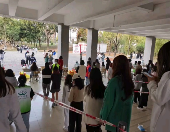 这两张图片拍摄于封校期间,我在当志愿者的时候,其他工作人员和同学说拍下的。当时封校通知很紧急,核酸检测缺大量有丰富经验的志愿者,‘时间急,任务重’。而我之前做过多次类似的志愿者活动,懂的如何去处理维持秩序。所以就勇当先锋去当志愿者,勇气战胜了害怕,当时我还带了酒精消毒液帮其他志愿者消毒。