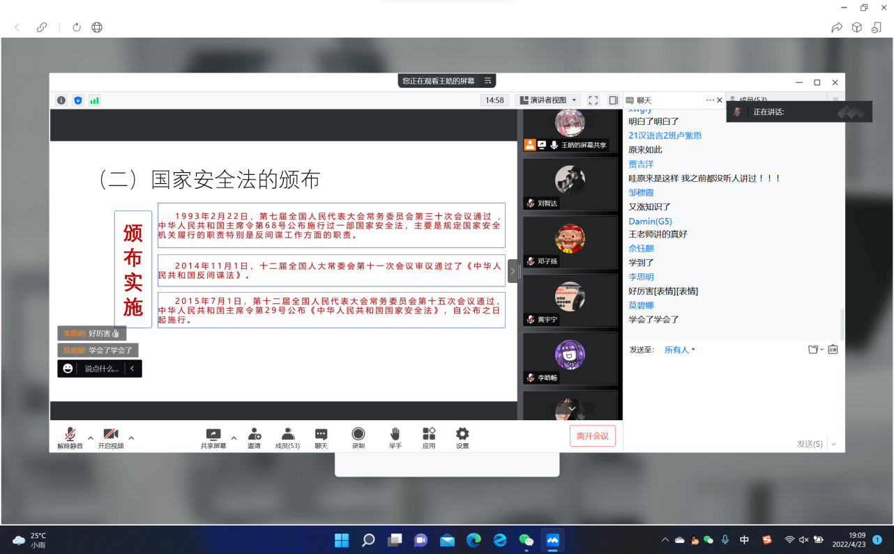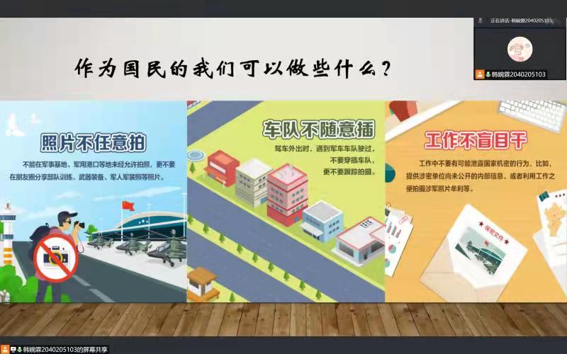 本次活动由各班班干组织宣传教育,宣讲方式新颖独特,不仅仅有生动有趣的图文讲述,更有激烈的线上讨论环节,其中主要围绕“作为新时代青年的我们应该如何维护国家安全”这一问题展开“云讨论”。