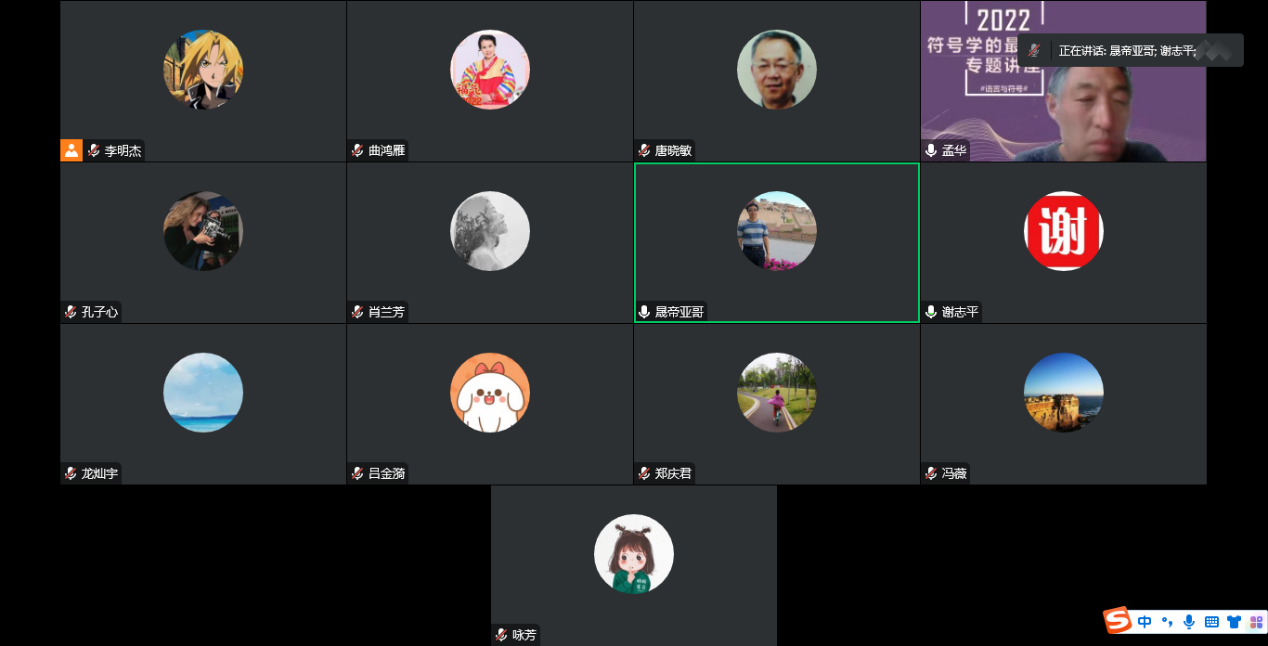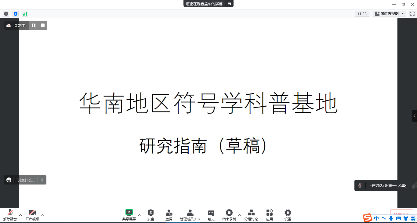 本网讯 华南地区符号学科普基地成立后,为扩大符号学新发展内容的科普,激发本院全体专职老师明确自身研究方向的动力,与此同时,搜寻对符号学感兴趣的人员,为华南地区符号学科研团队增员,中文学院于2022年12月20日下午举办以“符号学在中文研究中的启发与应用”为主题的线上教研活动。此次讲座由中文学院副院长吴晟教授主持,孟华教授主讲,李明杰、曲鸿雁、唐晓敏、孔子心、肖兰芳、谢志平、龙灿宇、吕金漪、郑庆君、冯薇、孙咏芳等多位教师出席。