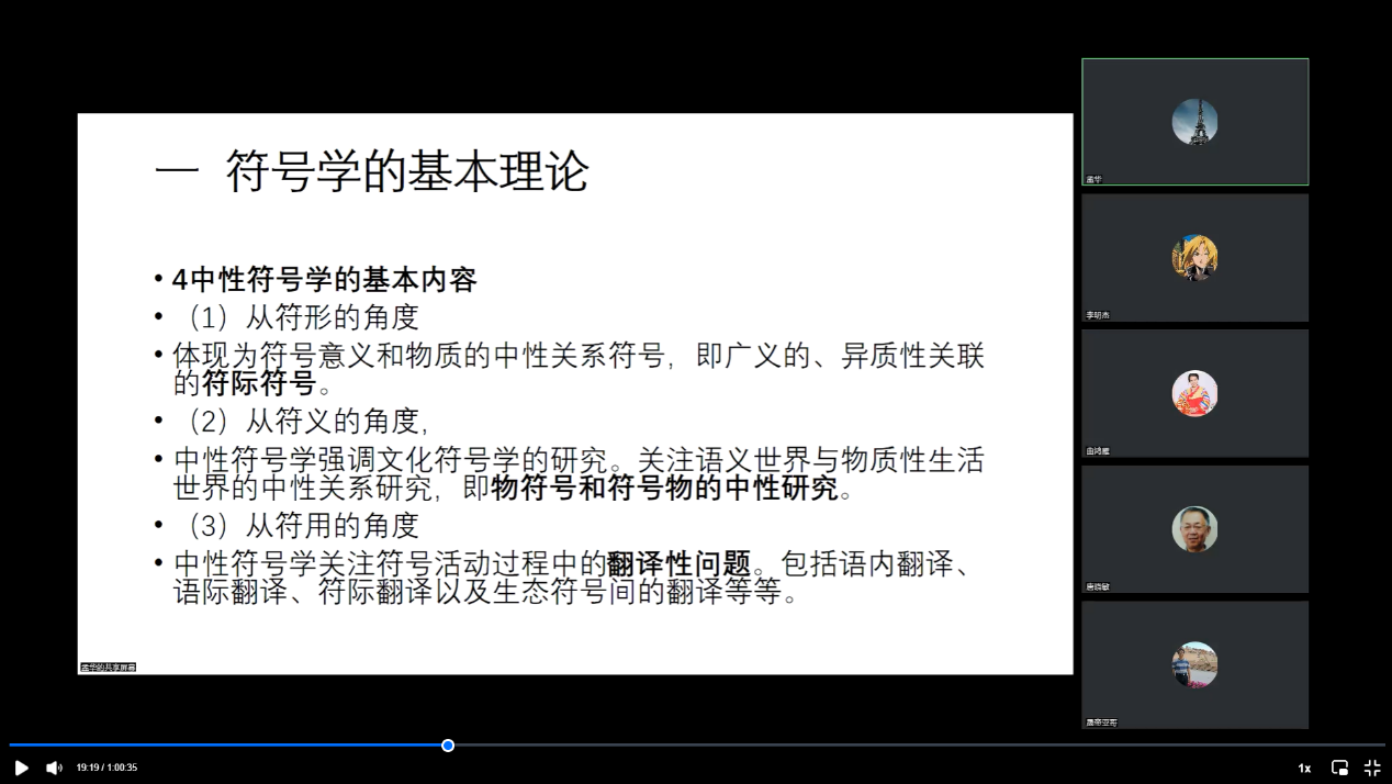 紧接着,孟华教授趁热打铁,与大家分享了他与王铭玉教授的研究:融合了符号学的三个传统为一体的具有中国特色的中性符号学。孟华教授从符形、符义和符用三个角度简单介绍了中性符号学的基本内容,通过对比三个符号学传统,并从符际符号、物符号和符号物的中性研究、及符号活动过程中的翻译性问题三个方面对中性符号学进行阐释。随后,他共享了一些中性符号学的研究指南,其主要分为四个板块:基本理论研究、符形层面的符际符号中性研究、符用层面的翻译符号学的中性研究,以及符义层面的文化符号的中性研究。这些课题不仅有利于明确参会人员对中性符号学的研究方向,也为未来探索符号学的奥秘埋下了思想种子。
