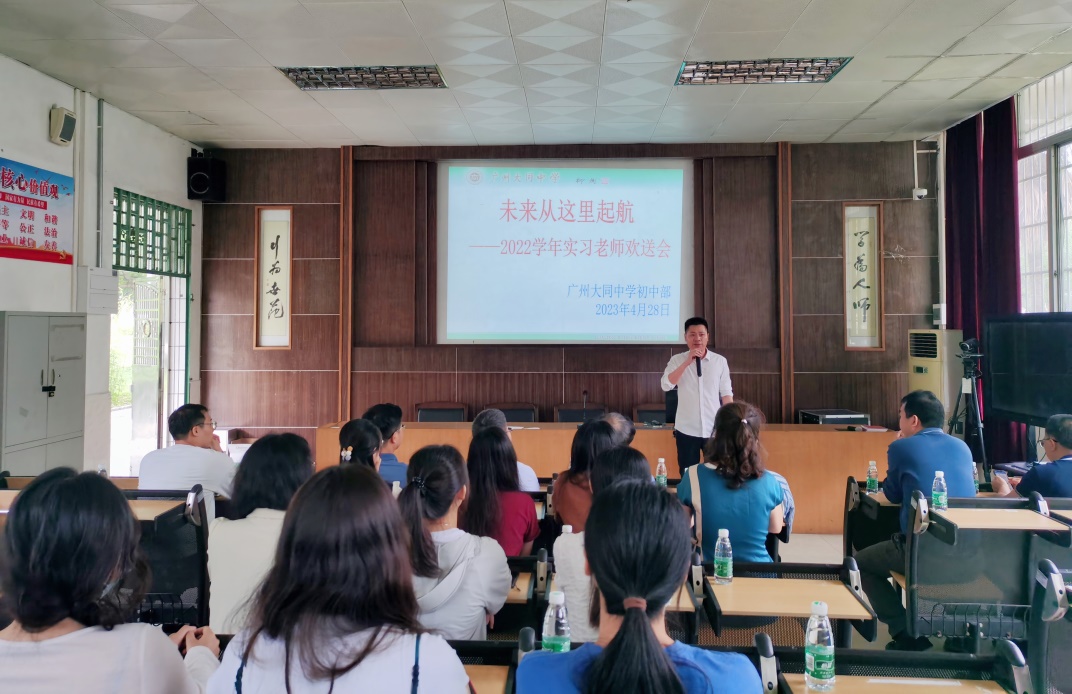 本网讯 多年来,广州大同中学(初中部)一直是中文学院优质实习基地之一,本学期,我院继续输送优秀人才到大同中学实习。时光荏苒,为期八周的实习生活转眼就结束了。2023年4月28日上午,在温馨而美好的气氛中,大同中学为我院实习生举行“未来从这里启航”主题欢送会。本次会议由大同中学杨浩良副主任主持,中文学院院长王毅、副院长吴晟、冯钿书记、曲鸿雁教授、李明杰老师;大同中学孙涛副校长、萧剑光副校长、邝柏理副校长、冯剑雄主任、全体指导老师以及全体实习生参与本次活动。