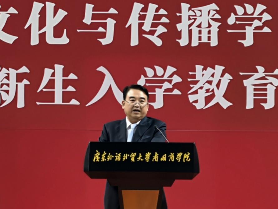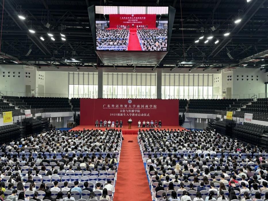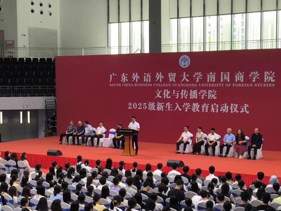 本网讯 2025年9月15日,广东外语外贸大学南国商学院文化与传播学院2025级新生入学教育启动仪式在学院体育馆隆重举行。学校副校长、文化与传播学院院长王关义教授,副院长吴晟教授、易文教授,彭祝斌教授、院长助理胡博副教授、梁施乐博士,以及相关专业教授和全体辅导员共同出席。