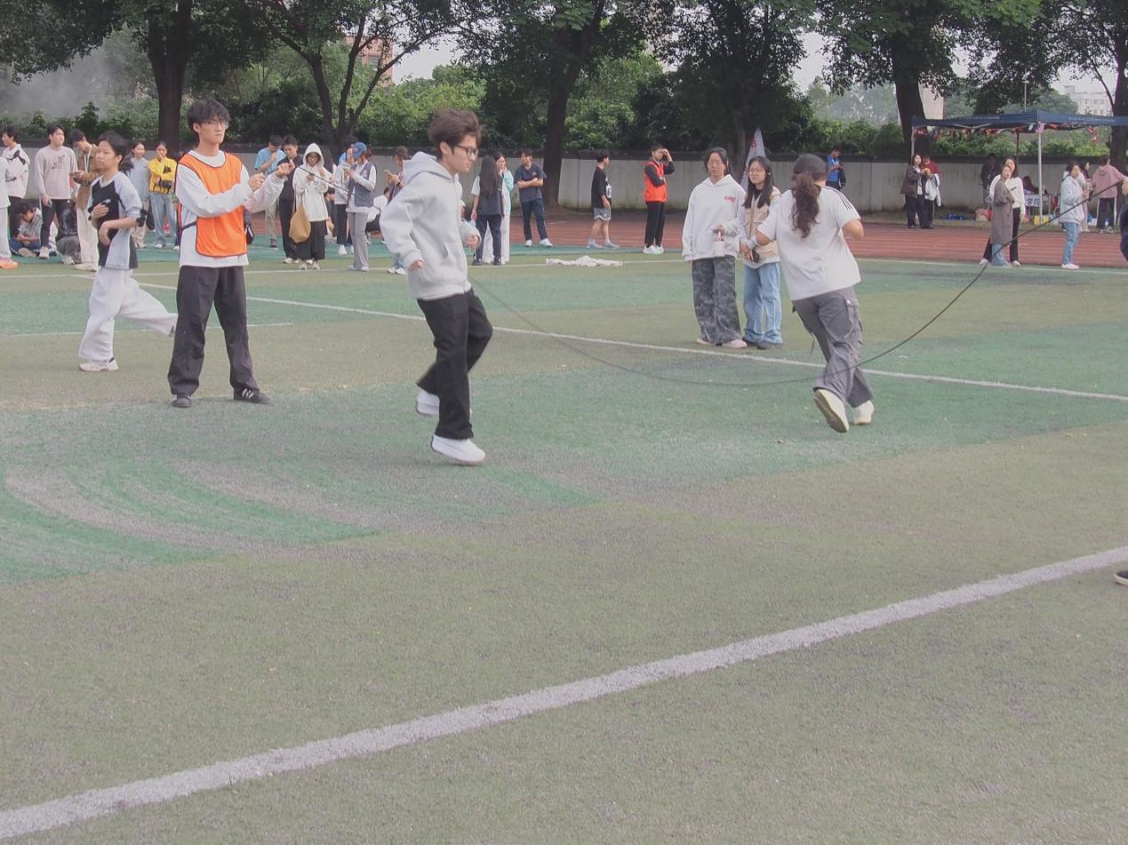 在团体长绳项目中,文传学院的十位同学们配合默契,绳子每一次落地都精准利落,队员们如一个默契的整体,跟着节奏同步跳跃。场边观众热情高涨,欢呼声此起彼伏。