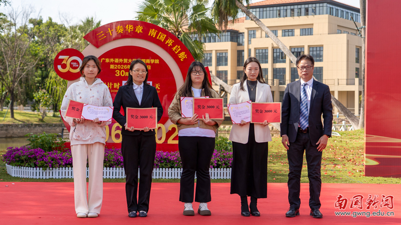 本网讯 2025年11月28日,广东外语外贸大学南国商学院30周年校庆倒计时一周年启动仪式在薪火草坪隆重举行。作为校庆系列活动首场重要文化活动的“稻浪·荷风”主题征文活动,其获奖名单在仪式上正式揭晓。我院多名师生凭借扎实的文字功底与深厚的情感表达荣登榜单,学院获奖代表在现场受到学校领导的表彰。