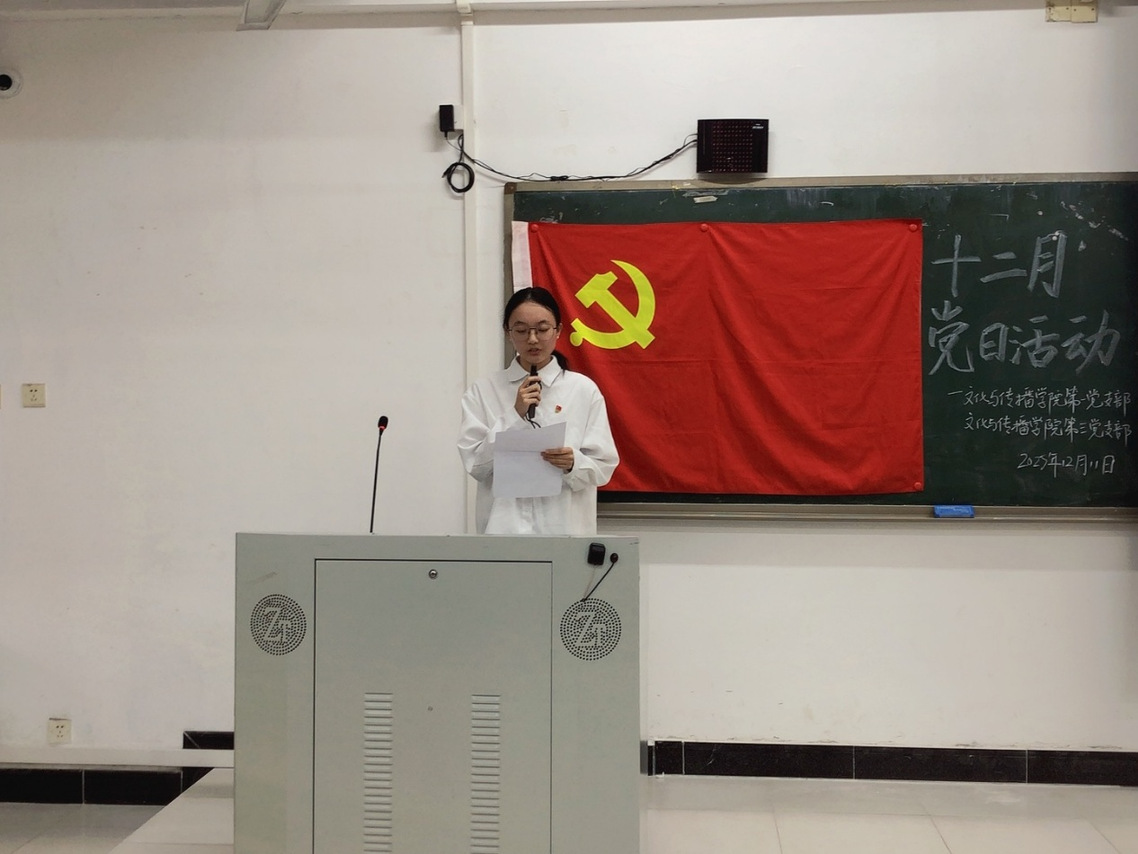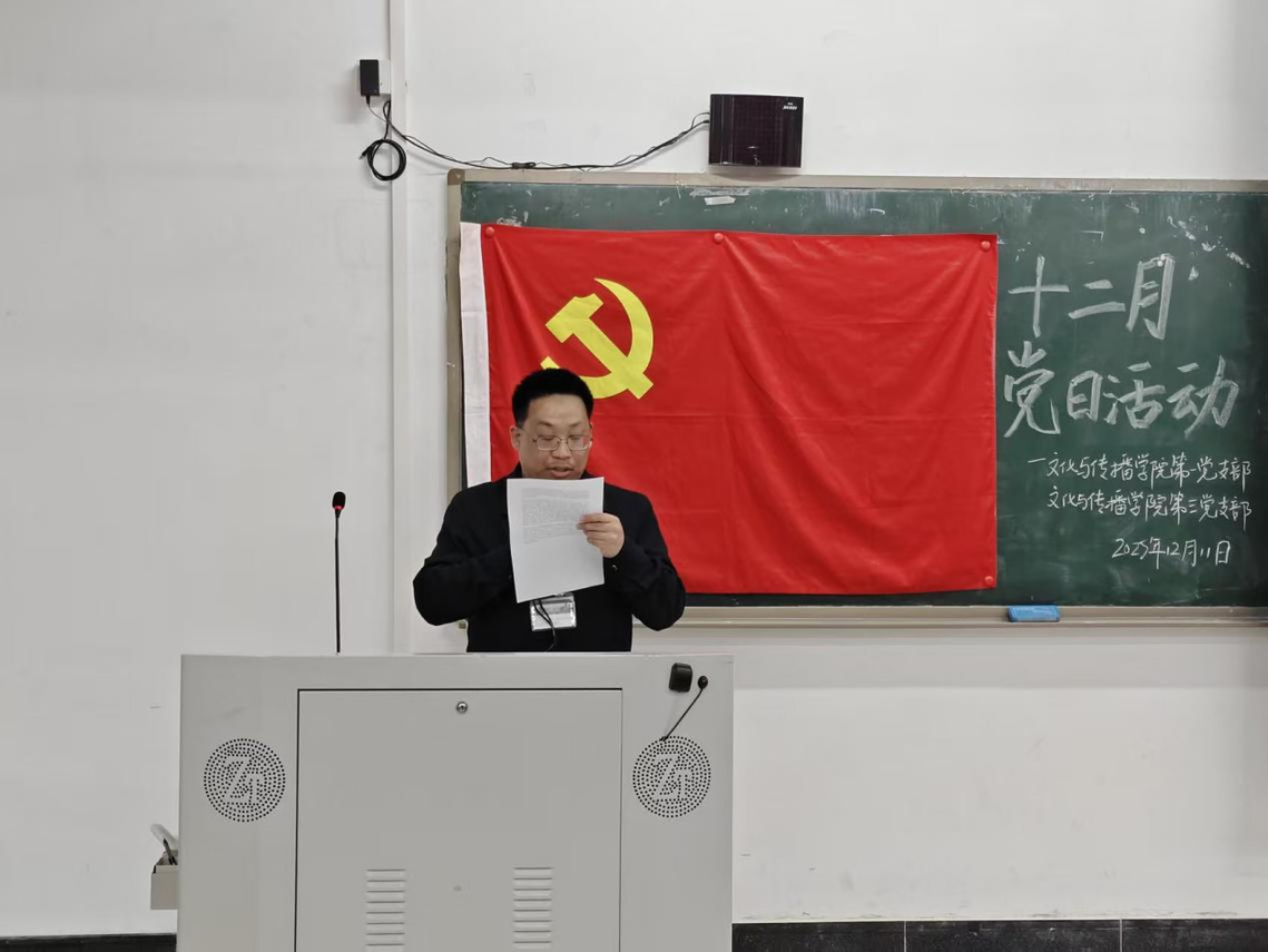 为深入学习贯彻党的二十届四中全会精神,推动中华优秀传统文化创造性转化与创新性发展,12月11日下午14:30,文化与传播学院第一党支部与第三党支部在F402联合开展了“千载非遗织锦色,一脉春风入党心”十二月主题党日活动。第一党支部书记梁施乐同志、副书记李明杰同志、第三党支部书记杨若颉同志出席活动。本次活动通过理论领学、心得分享、非遗体验等多个环节,将党性教育与文化传承深度融合,进行了一次深刻的思想淬炼与生动的文化实践。