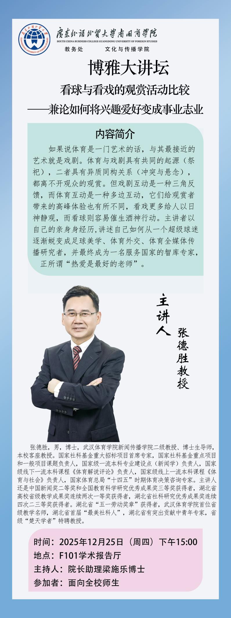 主讲人还是中国新闻奖二等奖和全国教育科学研究优秀成果奖三等奖获得者,湖北省高校省级教学成果奖连续两次一等奖获得者,湖北省社科研究优秀成果奖连续四次二三等奖获得者。湖北省“五一劳动奖章”获得者,武汉体育学院首位省级教学名师,湖北省首届“最美社科人”,湖北省有突出贡献中青年专家,省级“楚天学者”特聘教授。