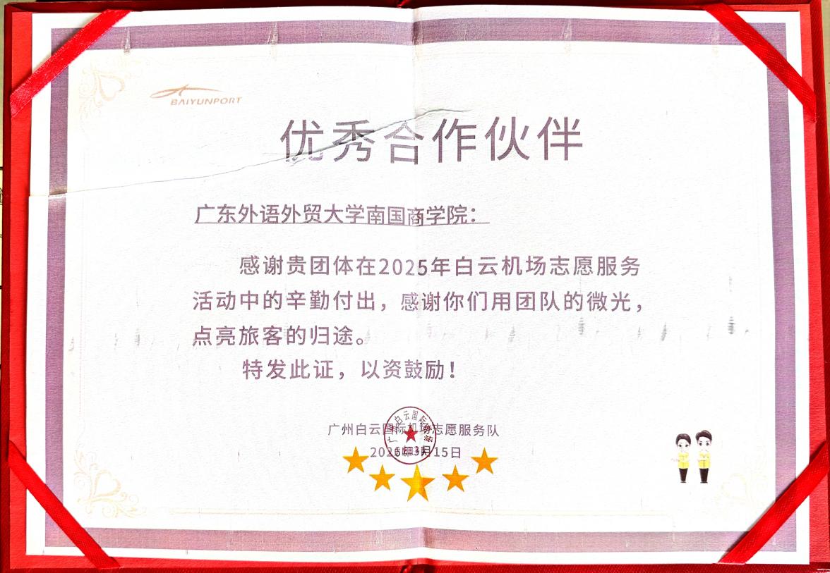 3月15日下午,文化与传播学院(以下简称“文传学院”)微光青云志愿服务队凭借良好的志愿作风荣获广州白云国际机场志愿服务队颁发的2025年“优秀合作伙伴”。