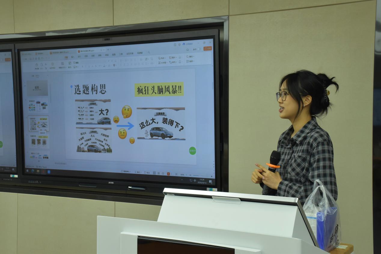 接着,第五届大广节铜奖获得者蔡颖妍学姐作为分享嘉宾,结合自身参赛经历,从选题、构思、团队协作到提案展示,全方位拆解备赛流程与同学们分享。她建议同学们从个人兴趣与小众命题入手,从而避开热门赛道的激烈竞争,同时强调了线下头脑风暴的重要性,避免因为线上信息沟通损耗程度过大而导致工作效率低下的问题出现。在团队协作方面,蔡颖妍学姐分享了组队需审美与能力相匹配、分工明确、建立共享文档等实践经验,还结合低成本创作、现场提案技巧等案例,为同学们提供了可落地的实操方法,让大家深受启发。