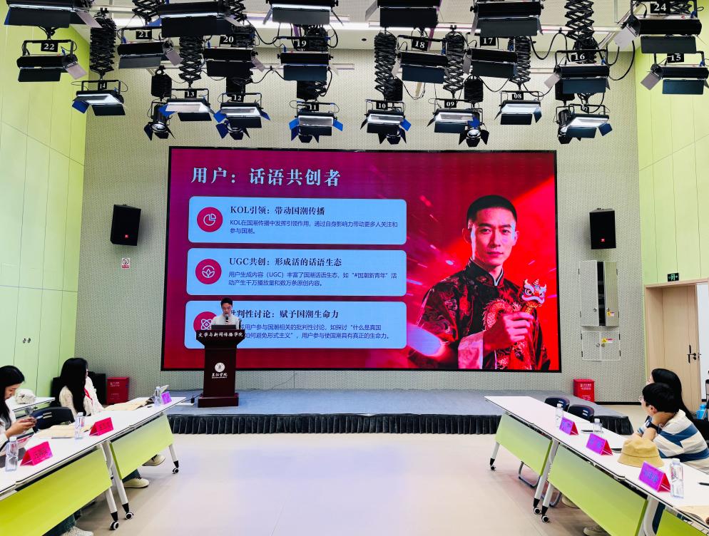 在专题发言环节,刘译壕教师从话语内容维度出发,系统考察复古符号与未来符号的融合拼贴模式,深度探究民族文化符号向时尚传播语言的转化路径,针对文化真实性与商业市场化之间的平衡张力问题展开深度剖析。研究结合抖音、小红书等主流新媒体平台的实际传播生态,细致观察头部KOL与普通用户的互动话语建构模式,针对汉服、潮玩、文旅等细分赛道的话语创新实践进行专项分析。同时,汇报对国潮话语发展现存的潜在问题开展批判性反思,明确指出符号空心化、话语同质化等行业风险,并前瞻性展望国潮时尚传播的未来发展方向。