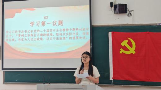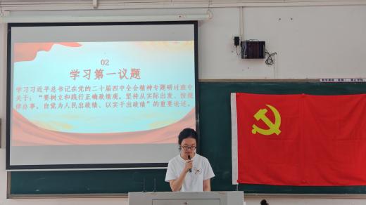 党员黄嘉欣同志带领全体同志开展“第一议题”学习。她在领学时指出,要深入学习习近平总书记在学习贯彻党的二十届四中全会精神专题研讨班上关于树立和践行正确政绩观的重要论述。习近平总书记强调,要坚持从实际出发、按规律办事,自觉为人民出政绩、以实干出政绩,为干事创业指明方向、提供根本遵循。作为学生党员,我们要把正确政绩观内化于心、外化于行:思想上强化理论学习,筑牢信念根基;工作上主动担当作为,以实干破解难题;服务群众时倾听呼声、解决急难愁盼;作风上力戒形式主义,以清廉赢得信任。大家表示,将牢记嘱托、实干担当,书写无愧于时代和人民的答卷。