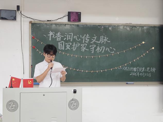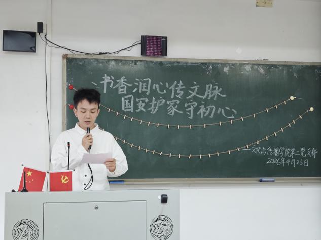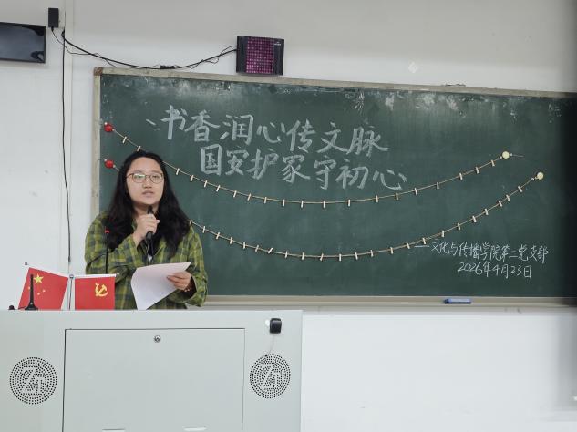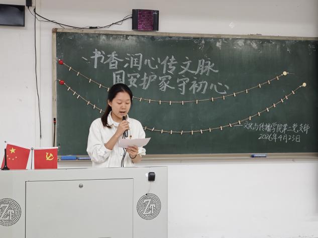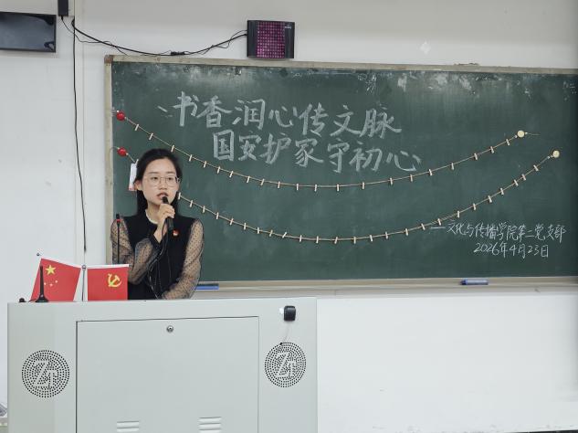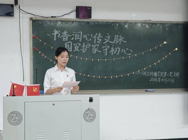 为深入学习贯彻总体国家安全观,引导党员传承弘扬中华优秀语言文化,扎实推进全民阅读与支部党建深度融合,4月23日,文化与传播学院第二党支部举办“书香润心传文脉,国安护家守初心”读书践诺主题党日活动。活动由发展对象吴静茹同志主持,党支部书记陈泳如老师及支部全体党员参加。
