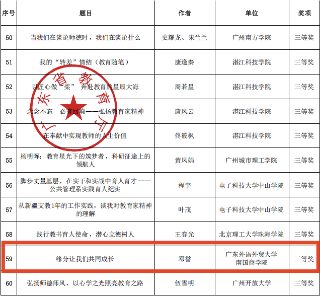 据悉,此次征文活动主题为“大力弘扬教育家精神,加快建设教育强国”。经各地各单位逐级遴选推荐、网络查重、专家评审、集中审议及结果公示,评选出师德主题征文优秀作品407篇。邓誉老师作品《缘分让我们共同成长》荣获三等奖,展现了其在师德师风建设方面的实践成果与深刻思考,此次获奖是对邓誉老师潜心育人、以德立教的充分肯定。