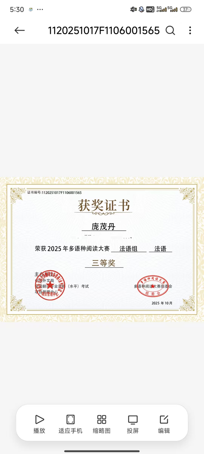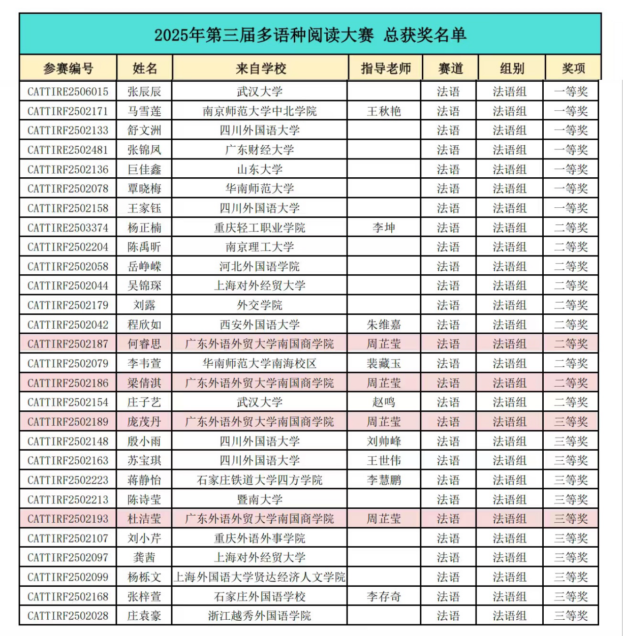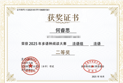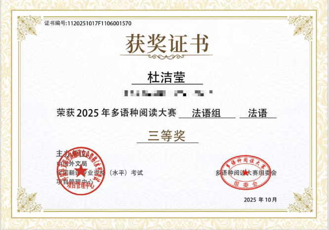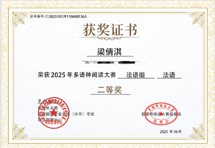 在今年10月30日公布的“2025年第三届多语种阅读大赛”总获奖名单中,我院法语系学子斩获4个奖项:2023级学生何睿思、梁倩淇荣获二等奖,2022级学生杜洁莹及2023级学生庞茂丹荣获三等奖。