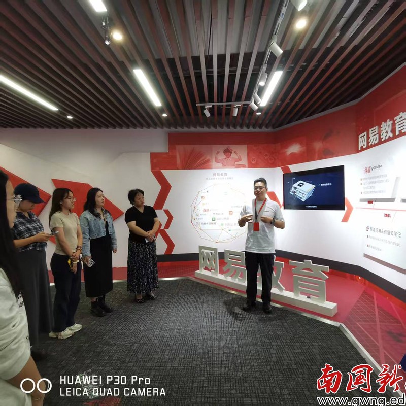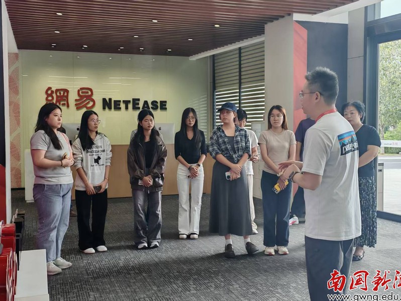 在网易有道智慧教育高校数字化总经理李征华先生的带领下,师生们首先参观了网易广州总部。李征华经理为师生们详细介绍了网易公司的发展历程、业务布局及企业文化,使同学们对这家互联网巨头从初创到辉煌的历程有了系统而深刻的认识。