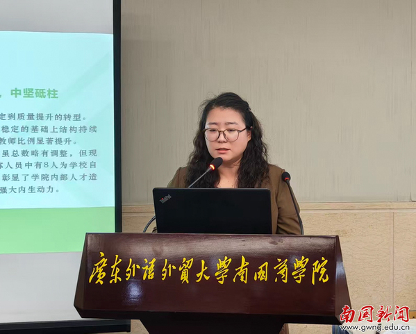 会议伊始,于凤颖结合学院工作实际情况,分享了学习党的二十届四中全会精神的心得体会。她表示,全会为学院发展提供了战略指引,外语学科应成为国家治理现代化与全球治理的“战略支点”。学院将秉持“深度国际化”核心与“融汇中西,服务传播”宗旨,通过人才培养、学科融合、师资转型三大支柱,培养服务国家战略的人才,为民族复兴贡献力量。随后,围绕师资队伍建设、学科专业建设、教育教学工作以及科学研究工作等四个方面对西语学院在“十四五”规划工作的任务指标完成情况进行全面总结。她指出,西语学院在“十四五”期间全面推进各项事业发展,取得显著成效,并在多个方面实现结构性优化与质量提升。她强调,学院将持续加强学科内涵建设,推动省级一流学科与专业突破,提升科研创新能力,优化师资结构,深化教学改革,以更高水平服务国家战略需求,谱写发展新篇章。