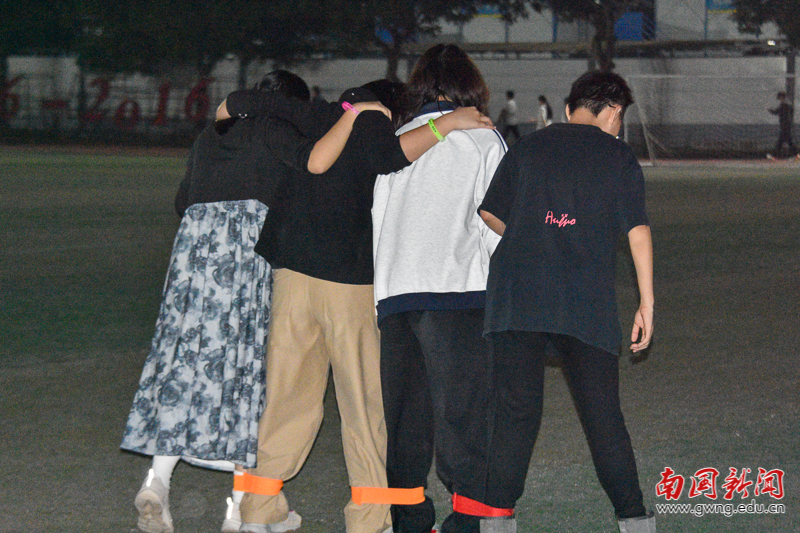 在操场草坪上开展N人N足活动时,选手们绑腿结伴,彼此紧挽手臂。哨响后,他们喊着口号同步迈步,过程中虽有摔倒、落后等情况,但都凭借团结协作、相互扶持,克服重重困难,成功抵达了终点。