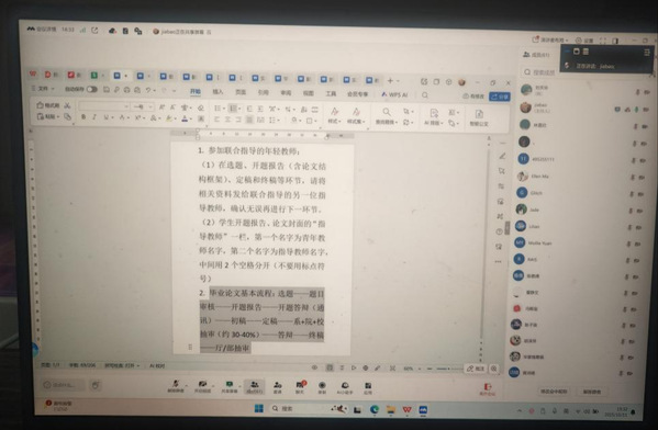 10月11日,英文学院组织召开2026届毕业论文指导线上说明会,会议由王家宝副院长主持,全体毕业论文指导教师参加。会议伊始,王家宝副院长对校内外教师的倾力支援表示感谢,面对今年713名毕业生这一历史新高的指导重任,论文工作尤为繁重艰巨;为确保整体质量与进度,她随后就关键环节作出了重要部署。