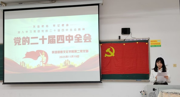 为深入学习贯彻党的二十届四中全会精神,切实把全体党员的思想和行动统一到党中央决策部署上来,英语语言文化学院第二党支部于2025年11月19日下午在G101召开党员大会,围绕党的二十届四中全会精神开展专题学习,推动全会精神落地生根、走深走实。