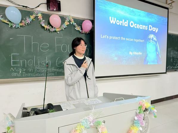 在演讲过程中,四位演讲者梁宇桐、石振鑫、黄加敏和何芷珊紧扣本期英语角主题,聚焦海洋威胁与保护、绿色技能在商务中的应用、环境问题与人类应对优势,以及海洋噪音污染的相关情况与解决建议。
